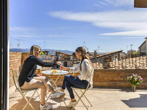 L'apartament Tictac està distribuït en tres alçades diferents unides visualment que afavoreixen que la llum inundi tots els espais. Té una capacitat per a 8 persones, idealment dos matrimonis i quatre fills. El menjador està presidit per un singular balcó de fusta del segle XVIII. Al segon nivell trobareu una àmplia sala d'estar amb una gran terrassa davant de les muntanyes i teulades de la ciutat. I a la part superior unes acollidores golfes que complementen aquest deliciós i exclusiu apartament.